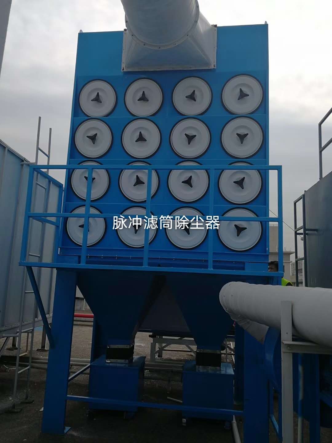 当带有粉尘的气体进入单机滤筒除尘器后,气体中大的颗粒粉尘由于重力的原因掉落下来,细小的粉尘的进入过滤室后,被吸附停留在滤料的表面,净化后干净的气体被排气口经过风机被排出,被隔离在滤料表面的粉尘,被单机滤筒除尘器的脉冲清灰系统喷吹,掉落至灰车,最后被清理!
